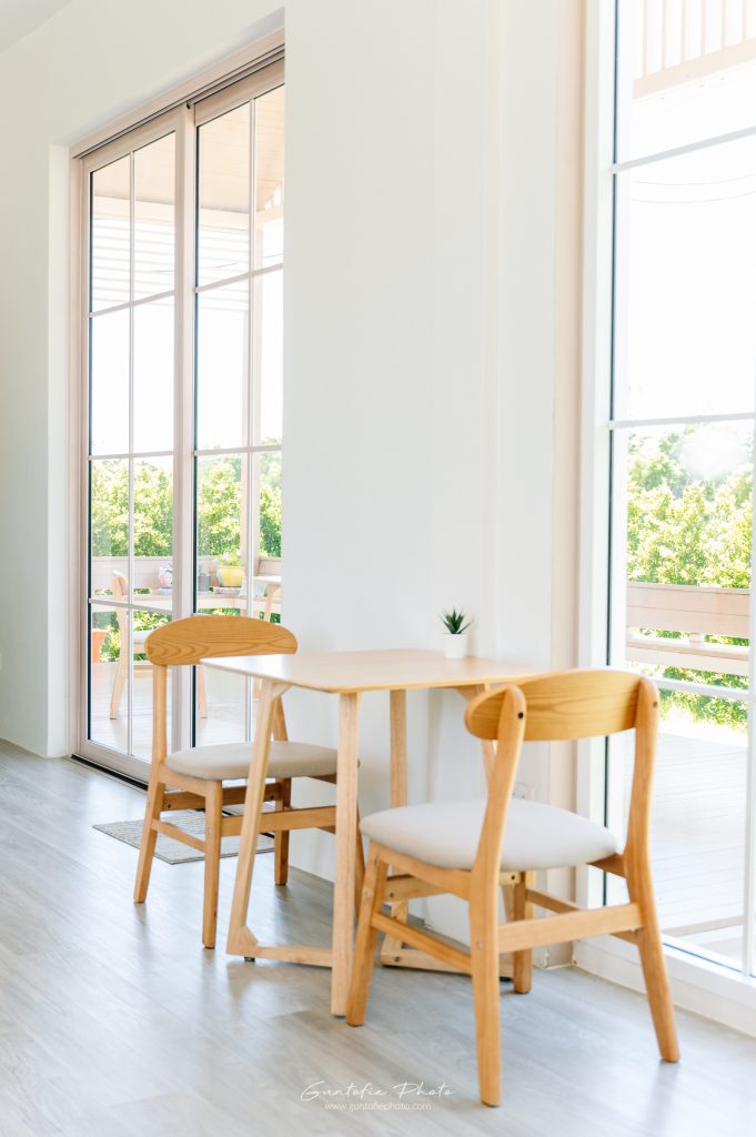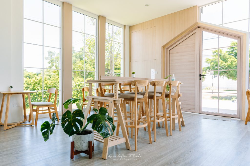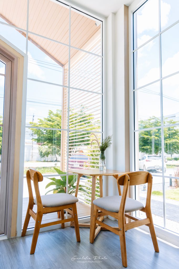 ภายในร้านตกแต่ง สไตล์มินิมอล กระจกบานใหญ่ สูงโปร่ง โต๊ะ เก้าอี้ไม้ ให้ความรู้สึกผ่อนคลาย เมื่อได้สัมผัส